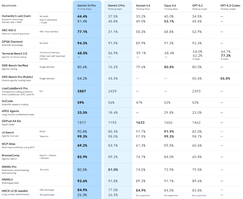 ▲ 제미나이 3.1 프로 벤치마크 비교표 (참고 이미지)