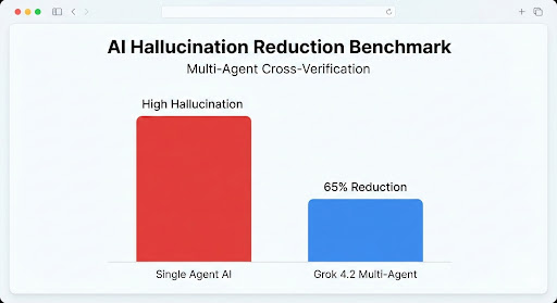 - 다중 에이전트(Multi-Agent) 시스템 도입가장 눈에 띄는 혁신입니다. Grok 4.2는 단일 AI가 생각하는 방식을 넘어, Grok, Harper, Benjamin, Lucas라는 4개의 특화된 에이전트가 동시에 병렬로 사고하고 서로 교차 검증하는 시스템을 갖췄습니다. xAI에 따르면 이 구조 덕분에 AI의 고질적 문제인 환각 현상(Hallucination)을 무려 65%나 감소시켰다고 합니다.
